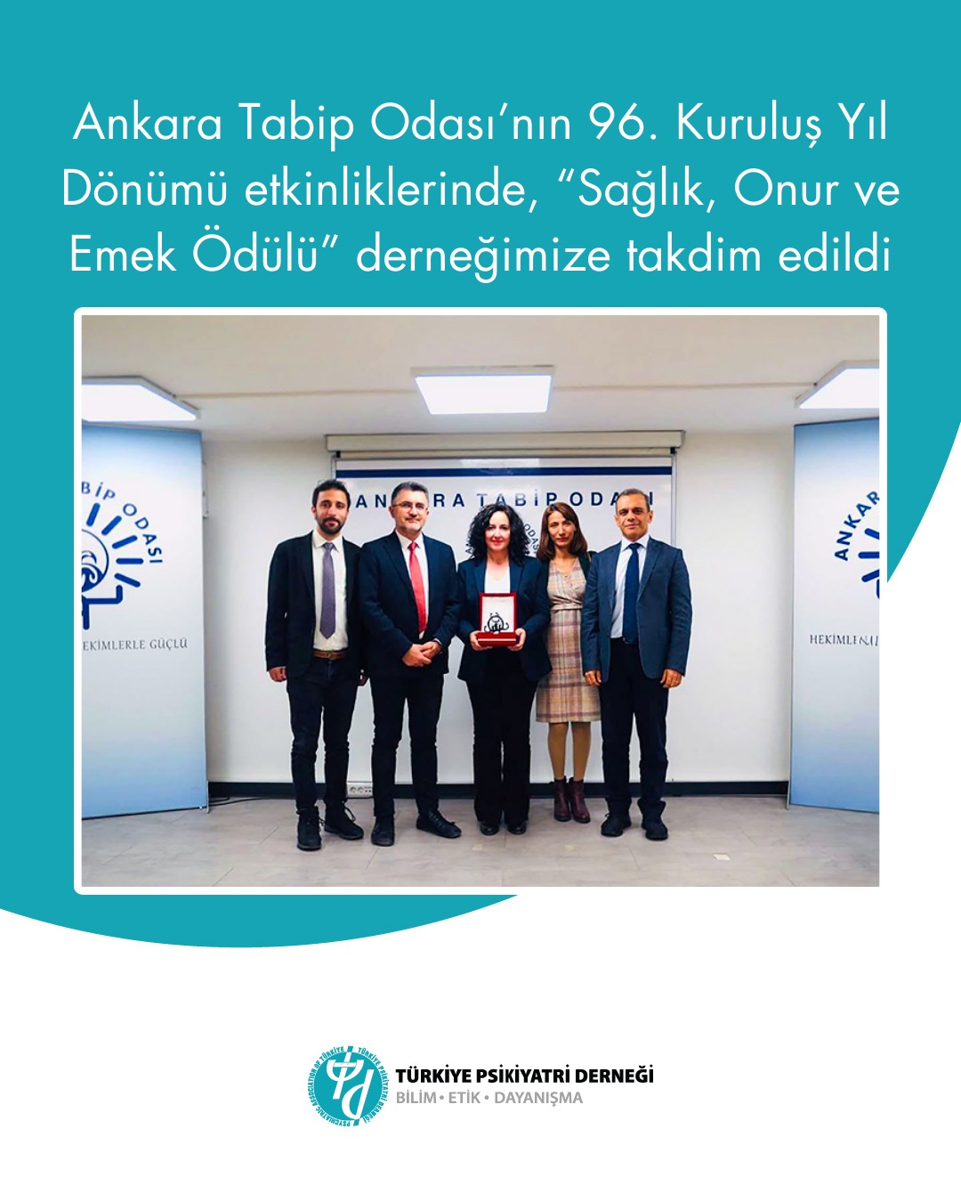Türkiye Psikiyatri Derneği, Ankara Tabip Odası'nın "Sağlık Onur ve Emek Ödülü"ne layık görülmüştür.